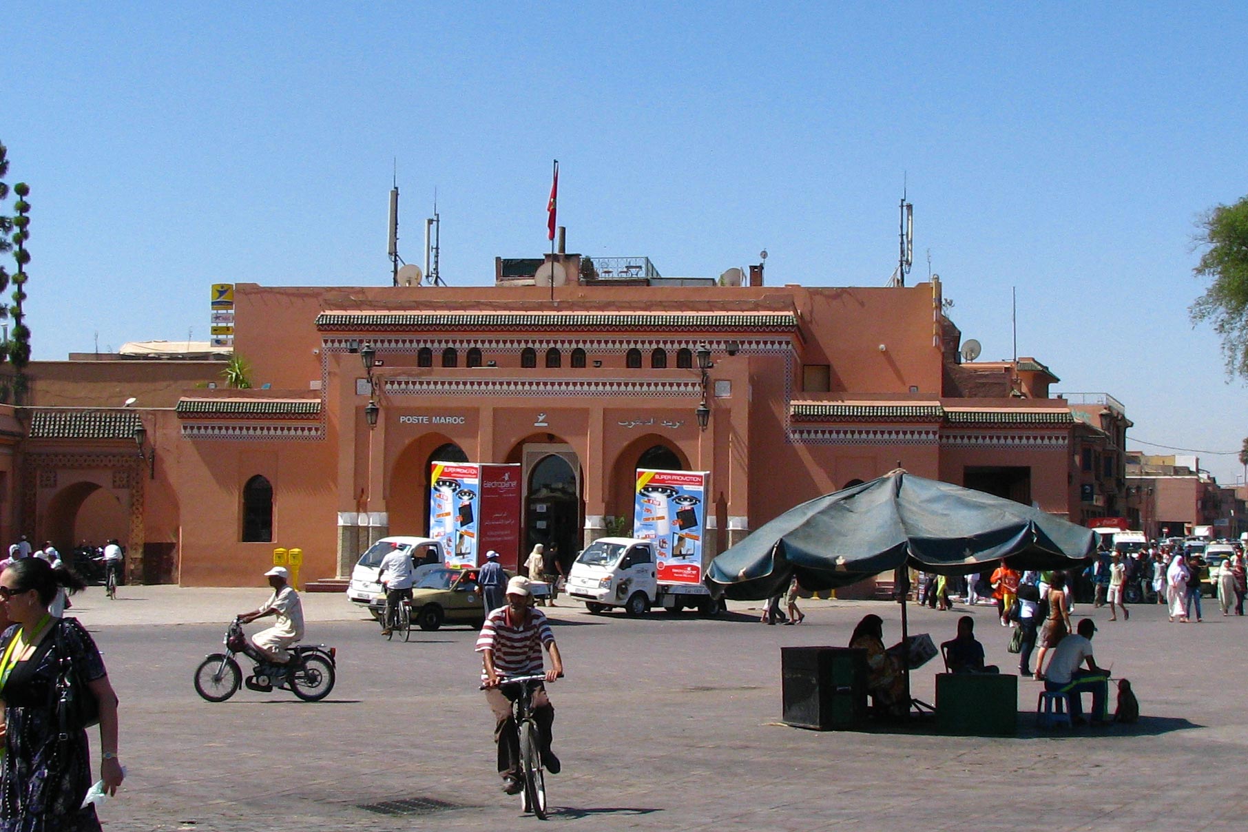 the taxi in front of the Djemaa el Fna post office building, marked “POSTE MAROC,” which is directly